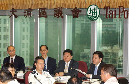 Secretary for Constitutional and Mainland Affairs Mr Stephen Lam (second right) attends a Tai Po District Council (DC) meeting this morning (September 4) to listen to DC members' views on the Green Paper on Constitutional Development.