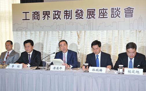 The Chief Secretary for Administration, Mr Henry Tang, attended a constitutional development forum organised by the Chinese General Chamber of Commerce this afternoon (May 13). Photo shows Mr Tang speaking at the forum. On his left is the Secretary for Constitutional and Mainland Affairs, Mr Stephen Lam.