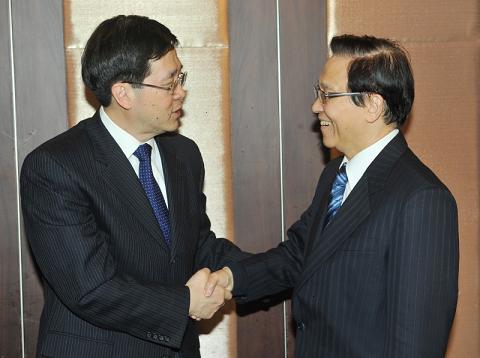 The Secretary for Constitutional and Mainland Affairs, Mr Stephen Lam, today (March 18) hosted a lunch for representatives of the visiting Kuomintang think tank. Mr Lam (left) is shown greeting the think tank's President, Mr Tsai Cheng-wen.