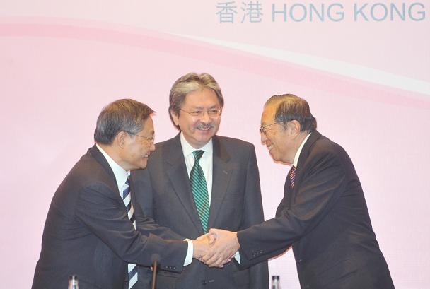 Mr Lin (left) and Mr Tsang shake hands at the joint meeting.