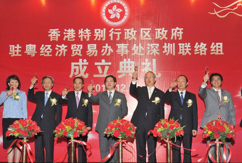 The Secretary for Constitutional and Mainland Affairs, Mr Stephen Lam (centre), officiated at the opening ceremony of the Shenzhen Liaison Unit in Shenzhen today (December 6). Photo shows Mr Lam, together with the Permanent Secretary for Constitutional and Mainland Affairs, Mr Joshua Law (third left), the Director of Hong Kong Economic and Trade Affairs, Guangdong, Mr Rex Chang (second right) and other guests, including the Vice Mayor of Shenzhen, Mr Chen Gaihu (fourth left), and the Deputy Director-General of the Economic Affairs Department of the Liaison Office of the Central People's Government in the HKSAR, Mr Wang Hui (fourth right), at the opening ceremony.