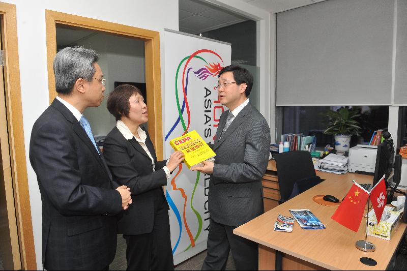 Mr Lam (right) and Mr Law (left) listen to a staff member of the Shenzhen Liaison Unit explaining the operation of the unit during their visit there today (December 6).
