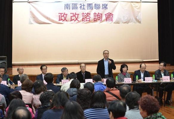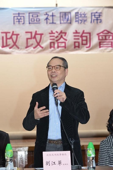 The Under Secretary for Constitutional and Mainland Affairs, Mr Lau Kong-wah (fourth right), attended a constitutional development seminar organised by community organisations in Southern District tonight (March 1) on the "Consultation Document on the Methods for Selecting the Chief Executive in 2017 and for Forming the Legislative Council in 2016" and listened to the views of the participants.