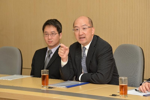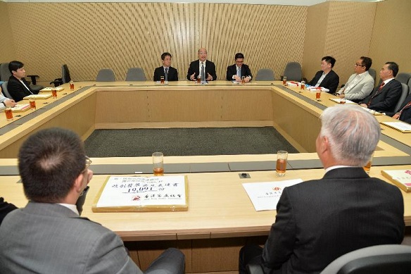 The Secretary for Constitutional and Mainland Affairs, Mr Raymond Tam (back row, centre), meets with members of the Chinese General Chamber of Commerce, the Hong Kong Hakka Associations, Hong Kong Federation of Huichow Associations and the General Association of Hong Kong Heyuan Societies to exchange views on the "Consultation Document on the Methods for Selecting the Chief Executive in 2017 and for Forming the Legislative Council in 2016" and receive their submissions on constitutional development this morning (April 28).