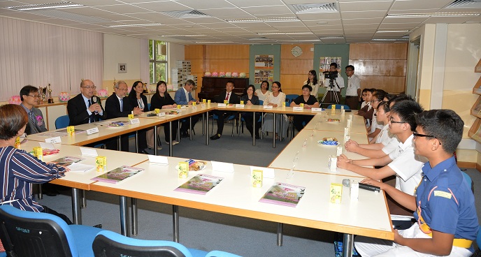 Mr Tam visits a secondary school in Islands District to learn about the support rendered by the school to students of ethnic minorities. Photo shows Mr Tam (third left) exchanging views with teachers and students of the school.
