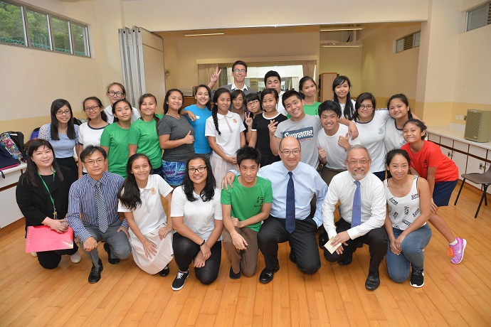 Mr Tam (front row, third right) with teachers and students after visiting a secondary school in Islands District.