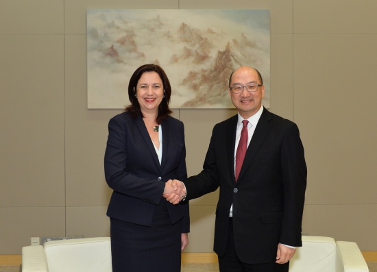 Mr Tam (right) and Ms Palaszczuk shake hands before the meeting.