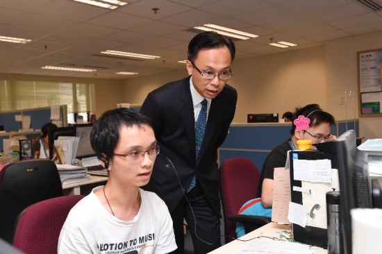 The Secretary for Constitutional and Mainland Affairs, Mr Patrick Nip, today (July 27) chats with staff of the hotline team of the Registration and Electoral Office to learn about the operation of the hotline.