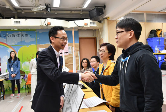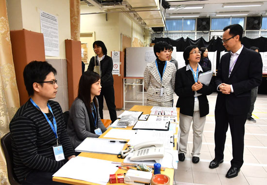 The Secretary for Constitutional and Mainland Affairs, Mr Patrick Nip, visited a polling station for the Central and Western District Council Tung Wah Constituency by-election set up at SKH St. Matthew's Primary School in Sheung Wan this morning (November 26). Photo shows Mr Nip (first right) being briefed by polling staff on the polling arrangements.