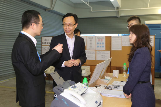 The Secretary for Constitutional and Mainland Affairs, Mr Patrick Nip, visited a dedicated polling station for the Central and Western District Council by-election set up at Happy Valley Police Station this morning (November 26). Photo shows Mr Nip (second left) receiving a briefing by staff of the polling station.