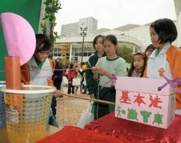 图示「校际《基本法》摊位游戏设计比赛2008/2009」小学组其中一队决赛队伍今日(二月二十一日)在「同心栽种我的家‧《基本法》嘉年华」会场內主持由他们设计及佈置的摊位游戏,现场市民踊跃参与。