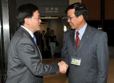 (广东话部份)我今次很高兴有机会正式访问台湾。这是应陆委会的邀请来进行工作会议,商討如何採取一些新的措施及安排,加强香港与台湾今后在经贸合作的交流及互动。明天我们举行工作会议后,会有机会再与大家见面,希望届时可以向大家介绍双方达成的共识。我们明日下午亦会与台北市政府会晤,希望藉此机会与台北市政府的领导商量香港与台北之间今后如何加强合作、交流与互动。