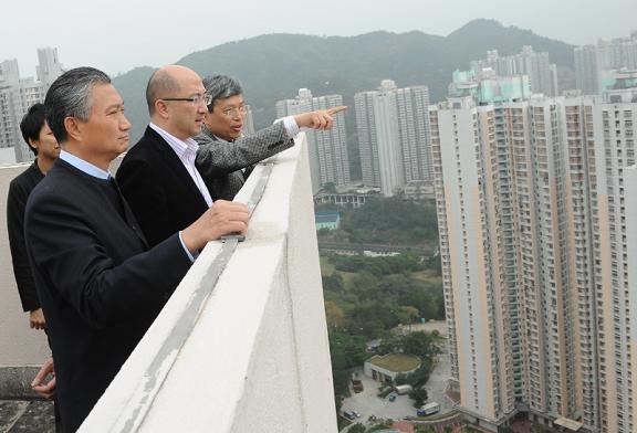 政制及內地事务局局长谭志源今日(二月四日)下午到访观塘区,以增加对区內事务的了解。图为谭志源(中)在秀茂坪邨一幢公屋大厦的天台鸟瞰观塘区,並听取观塘民政事务专员区庆源(右)就区內公共房屋的发展情况的简报。旁为观塘区议会主席陈振彬(左)。
