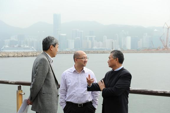 谭志源(中)在观塘海滨花园参观,並听取区庆源(左)及陈振彬(右)讲述该处的最新发展。