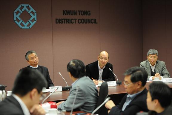 谭志源(中)在观塘区议会会议室与该区区议员会面,就他们所关注的广泛事务交换意见。