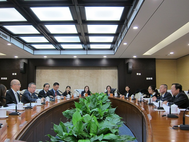 由政制及內地事务局局长谭志源率领的特区政府代表团今日(十月十二日)在北京进行特区政府与外交部的年度互访。代表团下午拜访文化部,了解他们的工作。图示谭志源(左一)及代表团成员与文化部港澳台办主任谢金英(右一)和他的团队交流。