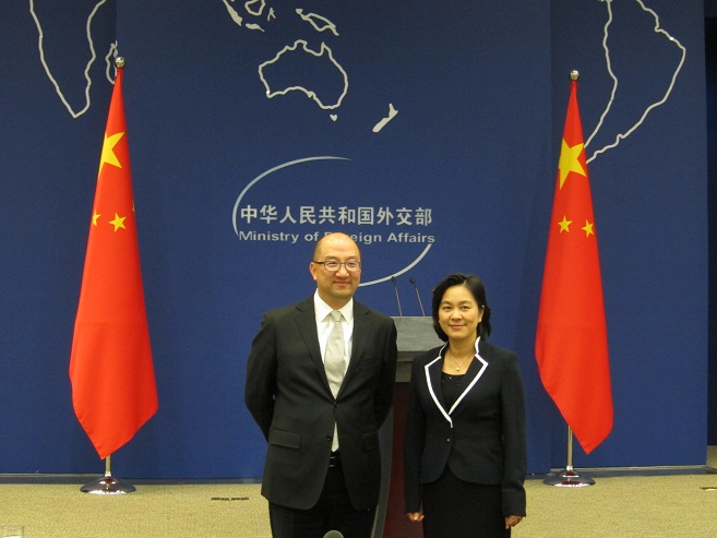 代表团今午拜访外交部新闻司,並观摩了外交部例行记者会。图示谭志源(左)与新闻司副司长兼发言人华春莹合照。