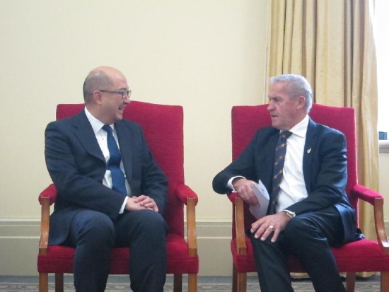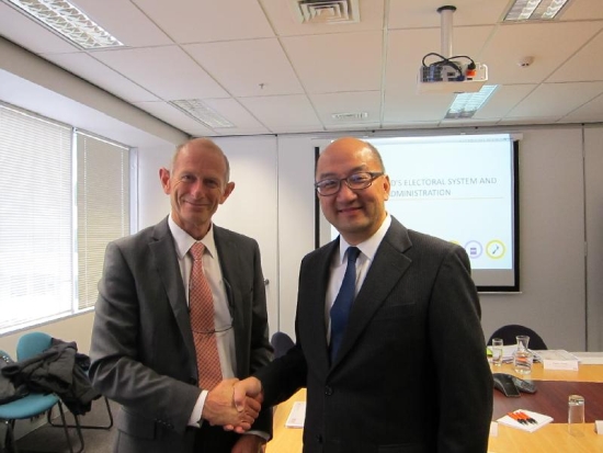 政制及内地事务局局长谭志源(右)今日(九月二十二日)下午在新西兰威灵与新西兰选举委员会首席选举主任Robert Peden(左)会面。