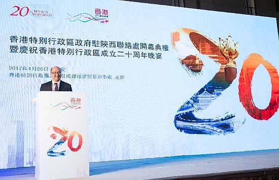 政制及内地事务局局长谭志源今日(四月二十六日)在陕西省西安市主持香港特别行政区政府驻陕西联络处开幕典礼暨庆祝香港特别行政区成立二十周年晚宴,标志着联络处的工作全面展开,也为即将在西安市举办的特区成立二十周年庆祝活动揭开序幕。