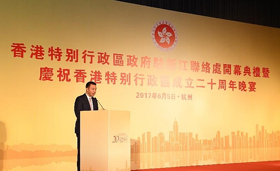 陈岳鹏在晚宴上致辞时表示,特区政府在浙江省开设联络处,目的是进一步加强浙江省和香港的交流合作,以及为当地港人港企提供更适切的服务。