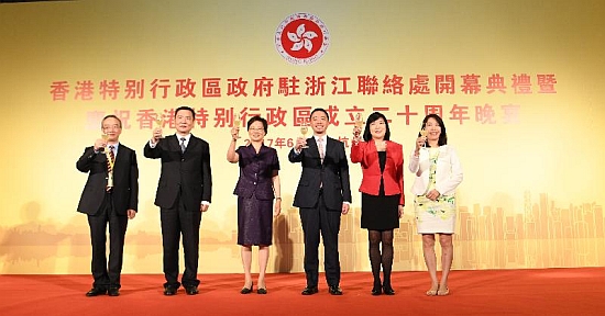 政制及内地事务局副局长陈岳鹏和浙江省副省长梁黎明今日(六月五日)在杭州主持香港特别行政区政府驻浙江联络处开幕典礼。图示陈岳鹏(右三)、梁黎明(左三)、香港特别行政区政府驻上海经济贸易办事处主任邓仲敏(右二)、驻浙江联络处主任廖凤娴(右一)、浙江省人民政府港澳事务办公室主任金永辉(左二),以及杭州市副市长陈新华(左一)主持祝酒仪式。