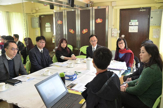 政制及内地事务局局长聂德权(左四)今日(二月十二日)到访东华三院支援性小众电话热线中心,聆听中心职员介绍热线中心的服务和运作。