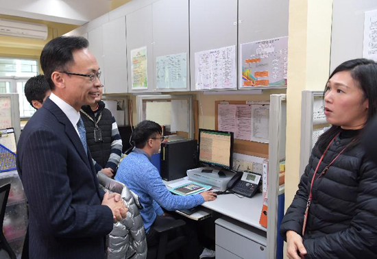 政制及内地事务局局长聂德权(左)今日(二月十二日)与东华三院支援性小众电话热线中心职员交谈,了解中心处理求助电话的情况。