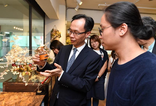 政制及内地事务局局长聂德权(左)今日(八月二十二日)下午参观位于深水埗的赛马会创意艺术中心,并聆听艺术工作者介绍布艺花卉作品。