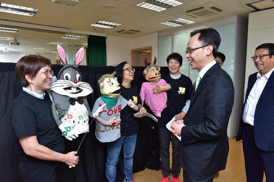 政制及内地事务局局长聂德权(右二)今日(十一月二十二日)下午到访湾仔区一间服务退休人士的活动中心,与参加手偶班的学员交谈,了解他们的退休生活和参与活动的得着。