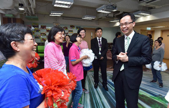 政制及内地事务局局长聂德权(右一)今日(十一月二十二日)下午到访湾仔区一间服务退休人士的活动中心,参观跳舞班的上课情况。