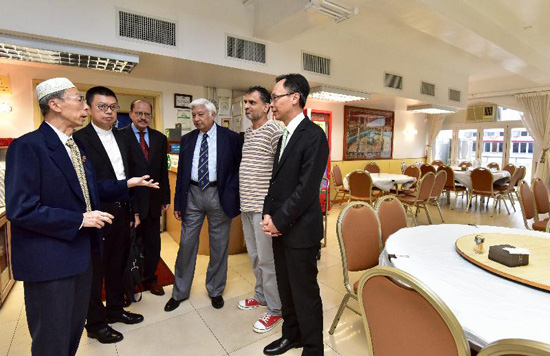政制及内地事务局局长聂德权(右一)今日(十一月二十二日)到访湾仔区的爱群清真寺暨林士德伊斯兰中心,参观中心内的食堂设施。