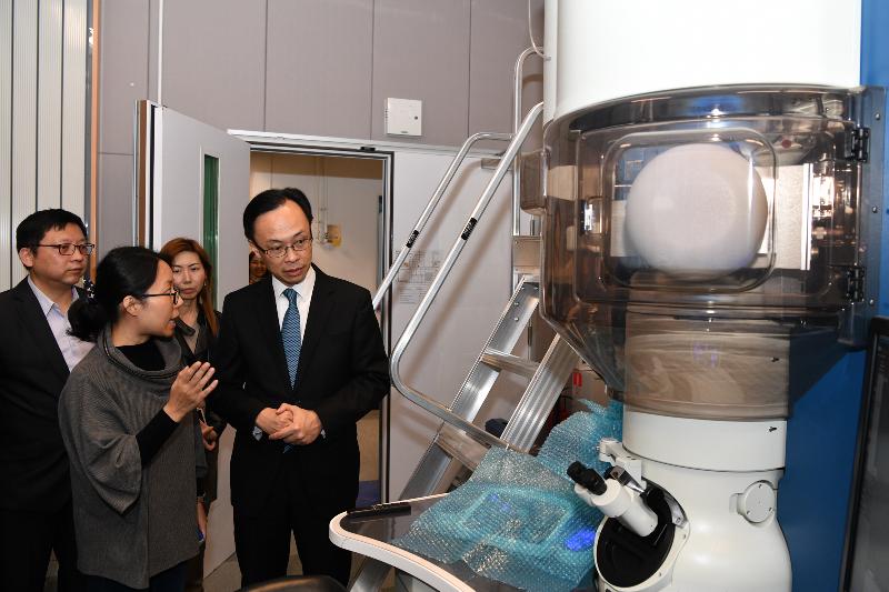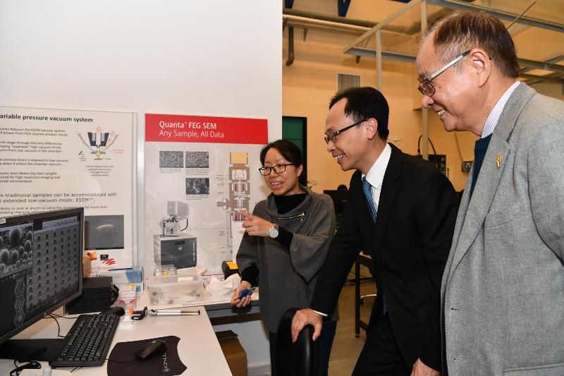 政制及内地事务局局长聂德权(右)今日(十二月二十八日)参观香港科技大学的材料测制实验所,听取科研人员介绍仪器运作。