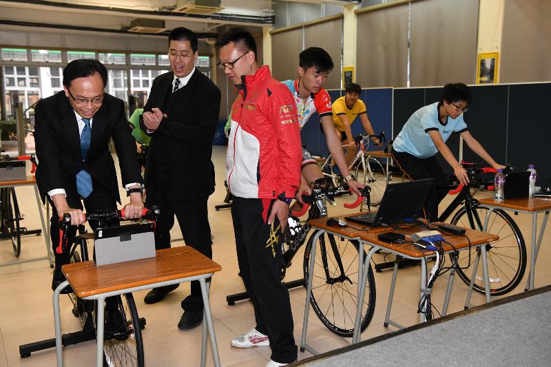 政制及内地事务局局长聂德权今日(十二月二十八日)下午到访西贡区一间中学。图示聂德权(左)在校内的单车练习室试用练习单车。