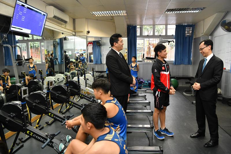 政制及内地事务局局长聂德权今日(十二月二十八日)下午到访西贡区一间中学。图示聂德权(右)与学校的划艇队员交谈,了解他们的练习情况。