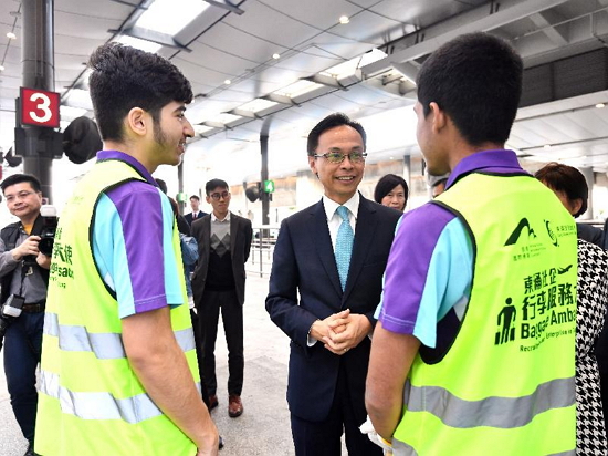 随后,聂德权前往机场的士站,了解机管局和东涌一间非政府机构合办的「行李服务大使」计划,并与两名担任大使的少数族裔同学倾谈,关心他们在香港的生活和读书情况。