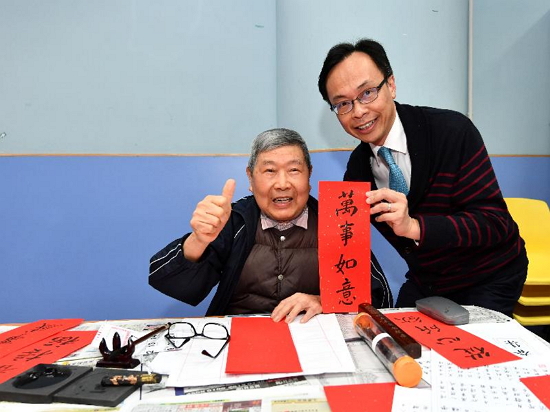 政制及内地事务局局长聂德权今日(一月三十一日)到访离岛区。图示聂德权(右)参观东涌一所综合服务中心时,与长者合照,并向他送上新年祝福。