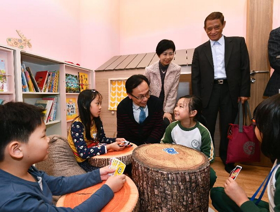 政制及内地事务局局长聂德权今日(一月三十一日)到访离岛区。图示聂德权(左三)参观东涌一所综合服务中心时,与参加中心活动的儿童交谈,了解他们的学习情况。