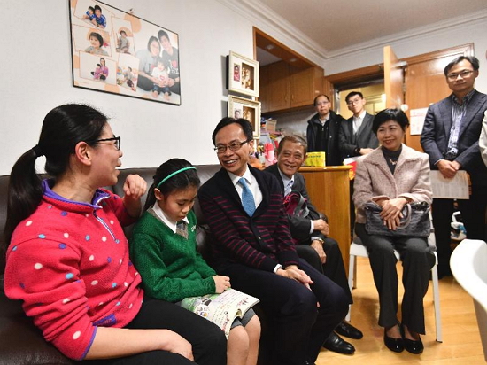 政制及内地事务局局长聂德权今日(一月三十一日)到访离岛区,并探访东涌区两个家庭。图示聂德权(右二)与其中一个家庭闲话家常,交流日常生活。