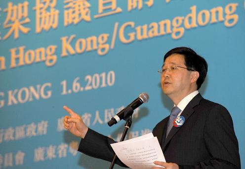 今天確实非常高兴能够与你们一起参与关於「粤港合作框架协议」(「框架协议」)的宣讲会。自回归以来,粤港合作对香港的发展极为重要:二○○九年国务院发表的《珠江三角洲地区改革发展规划纲要》及今年签订的「框架协议」,都是我们和內地合作以及和广东合作非常关键的里程碑。