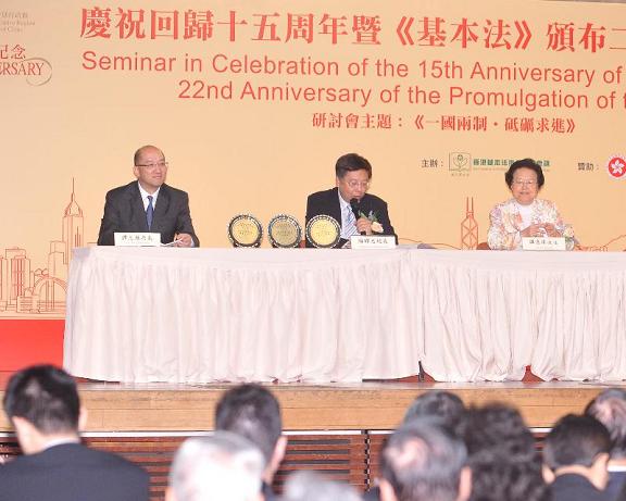 政制及內地事务局局长谭志源(左)今日(十一月三日)上午出席香港基本法推介联席会议(基推会)主办的「庆祝回归十五周年暨《基本法》颁布二十二周年研討会」,旁为基推会副主席杨耀忠校长(中)及香港特別行政区基本法委员会委员谭惠珠(右)。