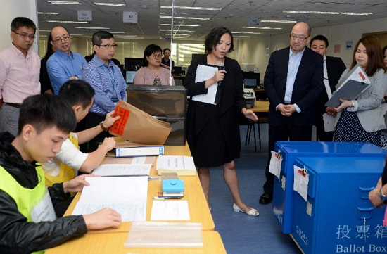The Secretary for Constitutional and Mainland Affairs, Mr Raymond Tam (second left); the Permanent Secretary for Constitutional and Mainland Affairs, Ms Chang King-yiu (first left) and and the Deputy Secretary for Constitutional and Mainland Affairs, Miss Rosanna Law (fourth left), are briefed by Registration and Electoral Office (REO) staff on the vote-counting arrangements for the 2016 Election Committee Subsector Elections during a visit to the REO today (October 4).