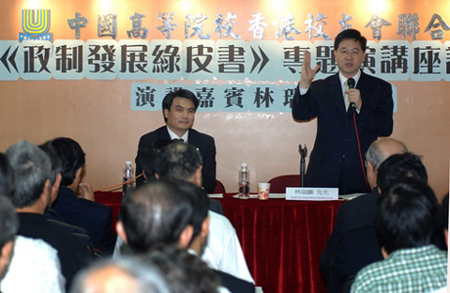 政制及內地事务局局长林瑞麟今日(九月六日)傍晚出席中国高等院校香港校友会联合会举办的专题讲座,向与会者介绍《政制发展绿皮书》的內容,並听取他们对此议题的意见。 |