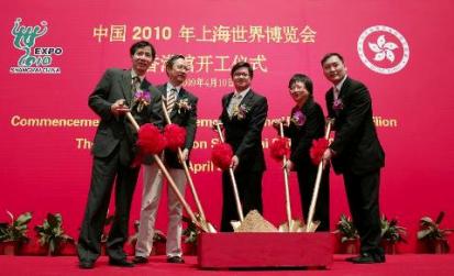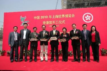 二○一○年世博香港馆动工兴建(三) 香港特別行政区驻上海经济贸易办事处主任陈子敬(左三)及香港馆馆长吴汉荣(左一)与其他嘉宾一同主持中国2010年上海世界博览会香港馆开工仪式。