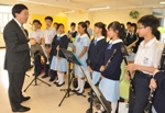 政制及內地事务局局长到访屯门一中学(四) 林瑞麟与明爱屯门马登基金中学步操管乐队成员交谈。