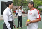 政制及內地事务局局长到访屯门一中学(六) 林瑞麟与一名参与板球练习的学生交谈。