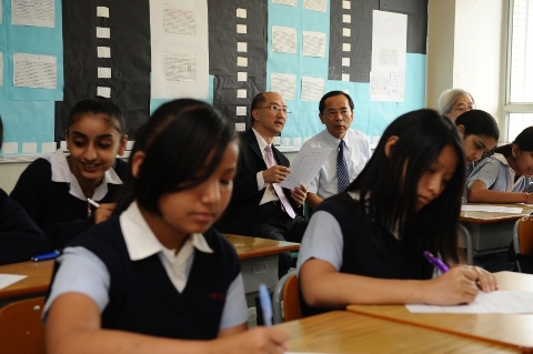 政制及內地事务局副局长到访西九龙一中学(一) 政制及內地事务局副局长谭志源今日(五月二十七日)到访官立嘉道理爵士中学(西九龙)。该校是首间为不同族裔学生提供本地中学课程的官立中学,学生当中约有百分之六十为非华语青少年。因应同学在学习能力上的不同,校方在英文和数学科实施分流教学和分班上课的安排,並提供三种不同程度的中国语文科课程以配合同学的需要。此外,校方积极在校內推广文化共融的讯息,亦重视让同学发挥各方面的才能。图示谭志源参观校內的图书馆,並阅读一本以印度语言撰写关於香港不同服务的资料书籍。