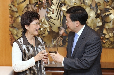 政制及內地事务局局长宴请台湾中国统一联盟(三) 林瑞麟和纪欣在席上合照。 |