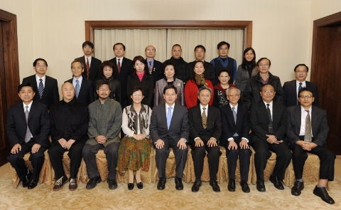政制及內地事务局局长宴请台湾中国统一联盟(二) 林瑞麟设宴招待来自台湾的中国统一联盟「一国两制参访团」,向他们介绍香港的最新发展。中国统一联盟今次是第七次派团访港,他们在港访问四天,目的是认识「一国两制」在香港的落实情况及加深对特区各方面的了解。图示林瑞麟(前排左五)与中国统一联盟参访团合照。前排为政制及內地事务局常任秘书长罗智光(左六)、中国统一联盟主席纪欣(左四)及中央人民政府驻香港特別行政区联络办公室台湾事务部副部长何志明(左七)。