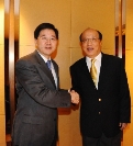政制及內地事务局局长林瑞麟今早(十二月八日)与访港的台中市市长胡志强共晋早餐,就促进港台间的合作和互动交换意见。图示林瑞麟与胡志强互相问好。
