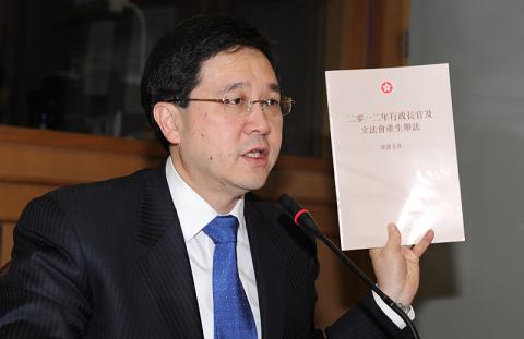 政制及內地事务局局长出席观塘区议会会议(一) 政制及內地事务局局长林瑞麟(右一)今日(一月八日)下午出席观塘区议会会议,討论《二零一二年行政长官及立法会產生办法諮询文件》。
